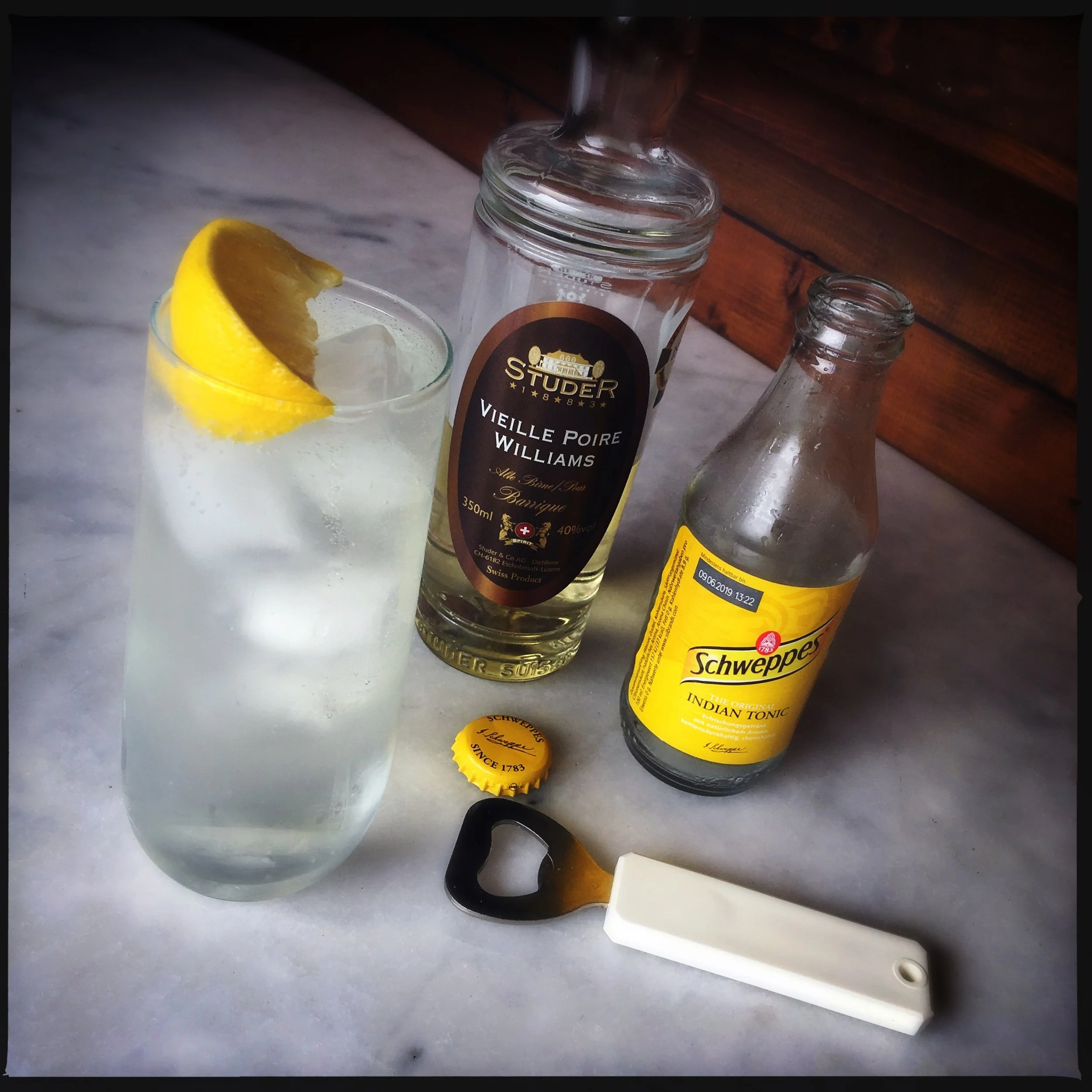 It's a shame though, because Switzerland's glorious fruit spirits are delicious and they mix well into many cocktails. Friedli-Studer replaces the gin in his tonic with a shot of Williams, for cool refreshment on a hot day.