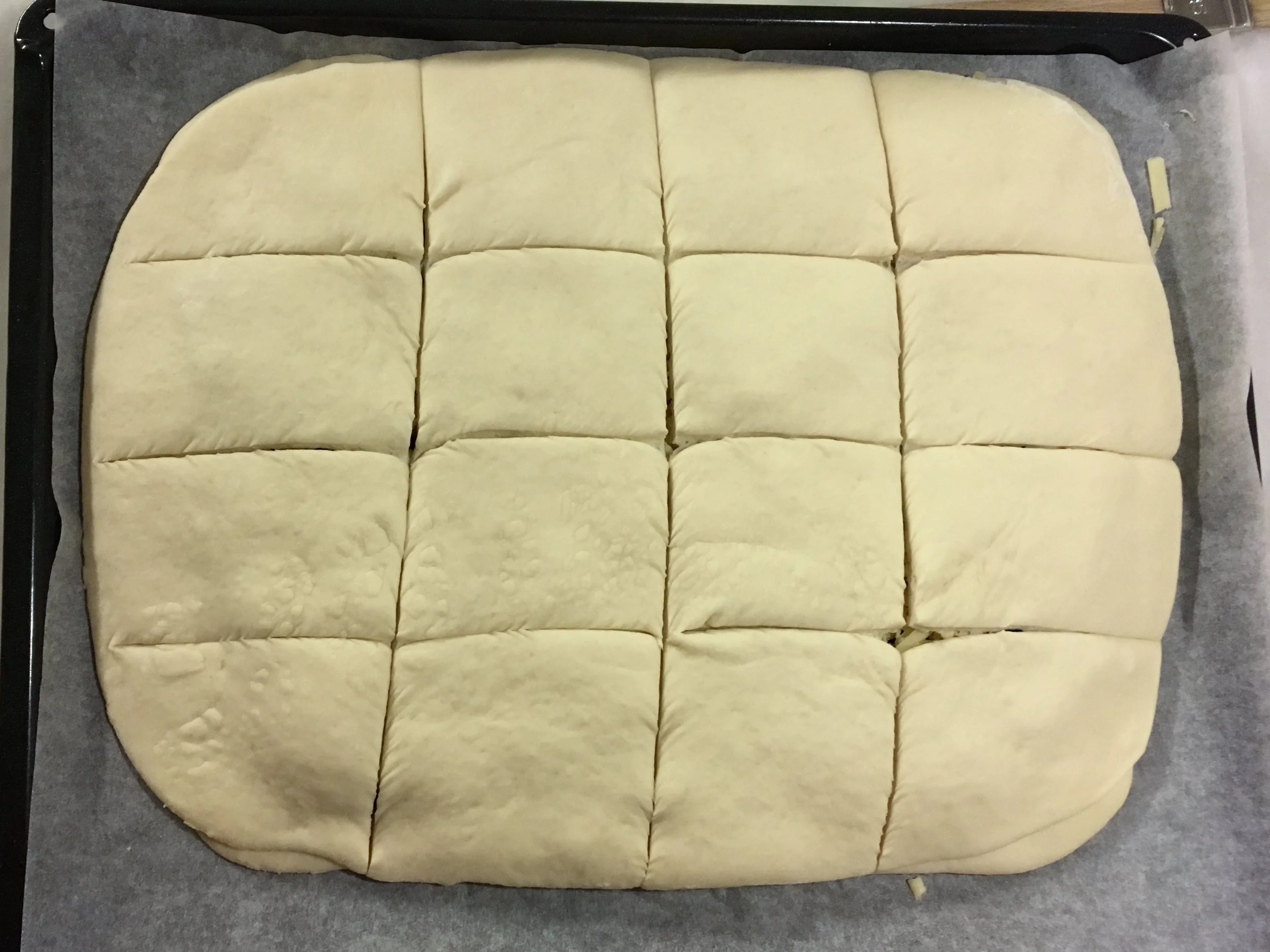 Using a sharp knife, cut about halfway into the top piece of dough to form 16 pieces. Do not cut all the way through the dough, this is just a guideline for cutting it once it has been baked.