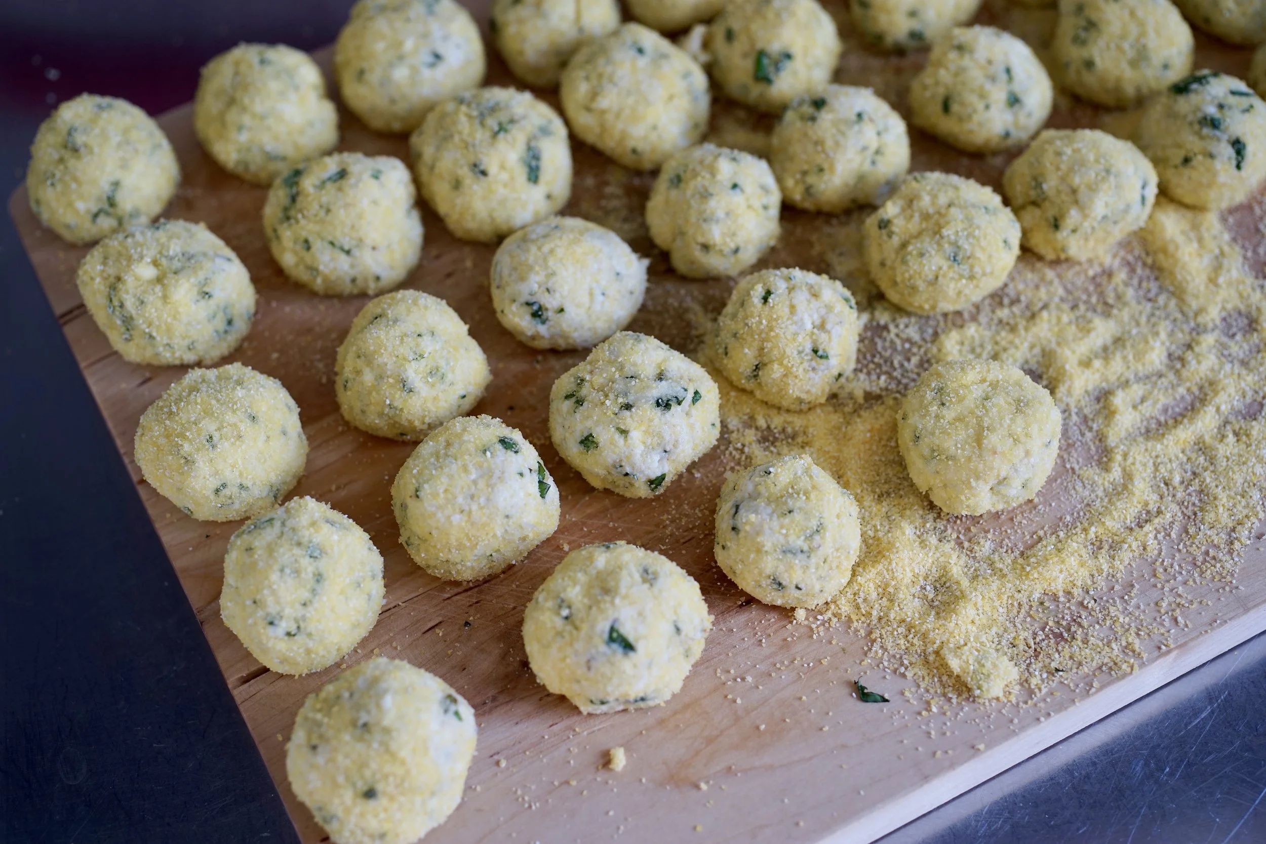 Scoop out a tablespoon or so of the mixture and and roll it in cornmeal, gently forming it into a ball.