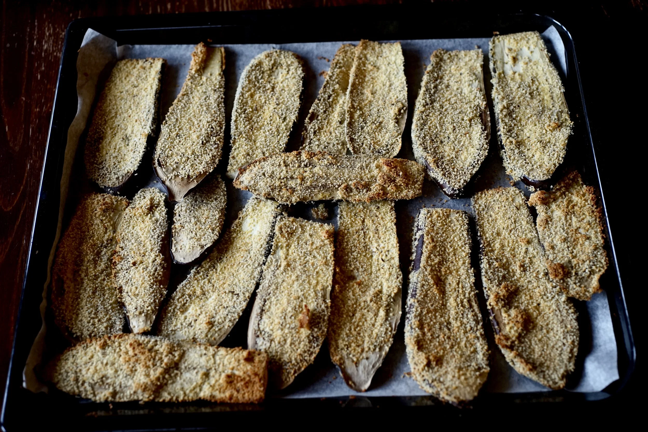 Piece by piece, dip the eggplant slices in flour, then egg, and then breadcrumbs. Place in a single layer on a parchment lined baking sheet.